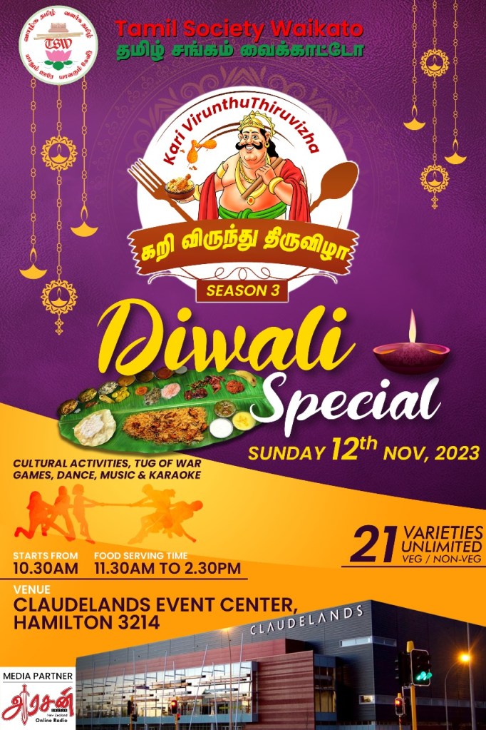 We cordially invite you and your family to come and celebrate this year’s special Diwali festival with our Karivirunthu – Season 3 on the 12 Nov 2023 at Claudelands Event centre, Hamilton.
